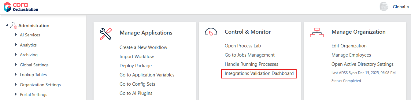 The Integrations Validation Dashboard application appears in the Control & Monitor tile in the Admin site home page. You can click the option to open the integrations dashboard.